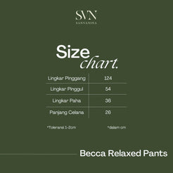 Detail Ukuran Bawahan: ALL SIZE Lingkar Pinggang : 76 cm Lingkar Pinggul : 146 cm Lingkar Paha : 80 cm Panjang Celana : 96 cm *Toleransi: 1-2 cm . Saran Perawatan : Untuk menjaga pakaian tetap terawat, cuci pakaianmu jangan terlalu kasar, pisahkan pakaian bedasarkan warna, tambahkan pelembut, balik pakaian saat mencuci dan dijemur. Setrika dengan suhu sedang . Pengiriman : Senin - Minggu . Proud to wear local brand SANVANINA #YourBetterOutfit